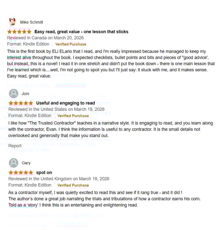 Eli Elario has spent his career inside the trades, working alongside contractors, business owners, and skilled tradespeople who do exceptional work and struggle to build the businesses their work deserves. He is the author of the Trusted Trades Series, a collection of business parables for tradespeople ready to stop chasing work and start attracting it, including The Trusted Contractor, The Trusted Electrician, The Trusted Plumber, The Trusted Mechanic, and The Trusted Concrete Contractor. He is also the author of The Roofing Business Blueprint and The Storm Chasing Roofing Blueprint, practical guides for roofing contractors building sustainable and profitable operations.